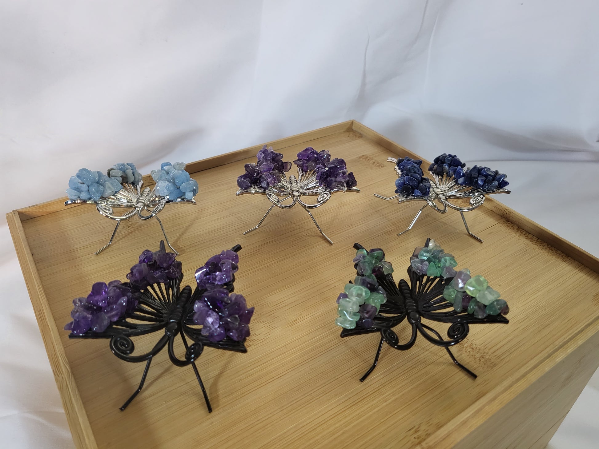 These beautiful Butterflies are adorned with crystal chips on the tips of the wings.