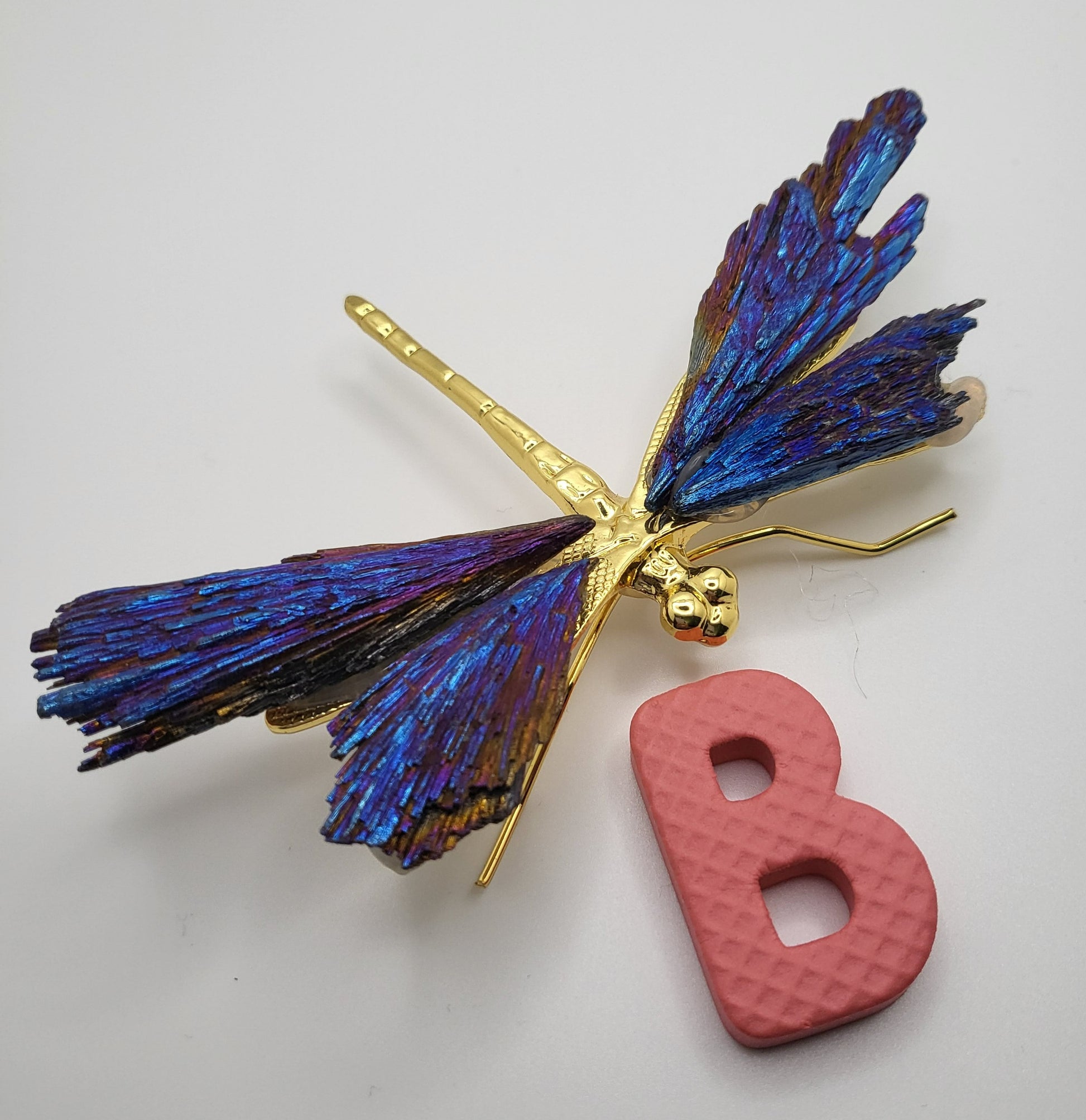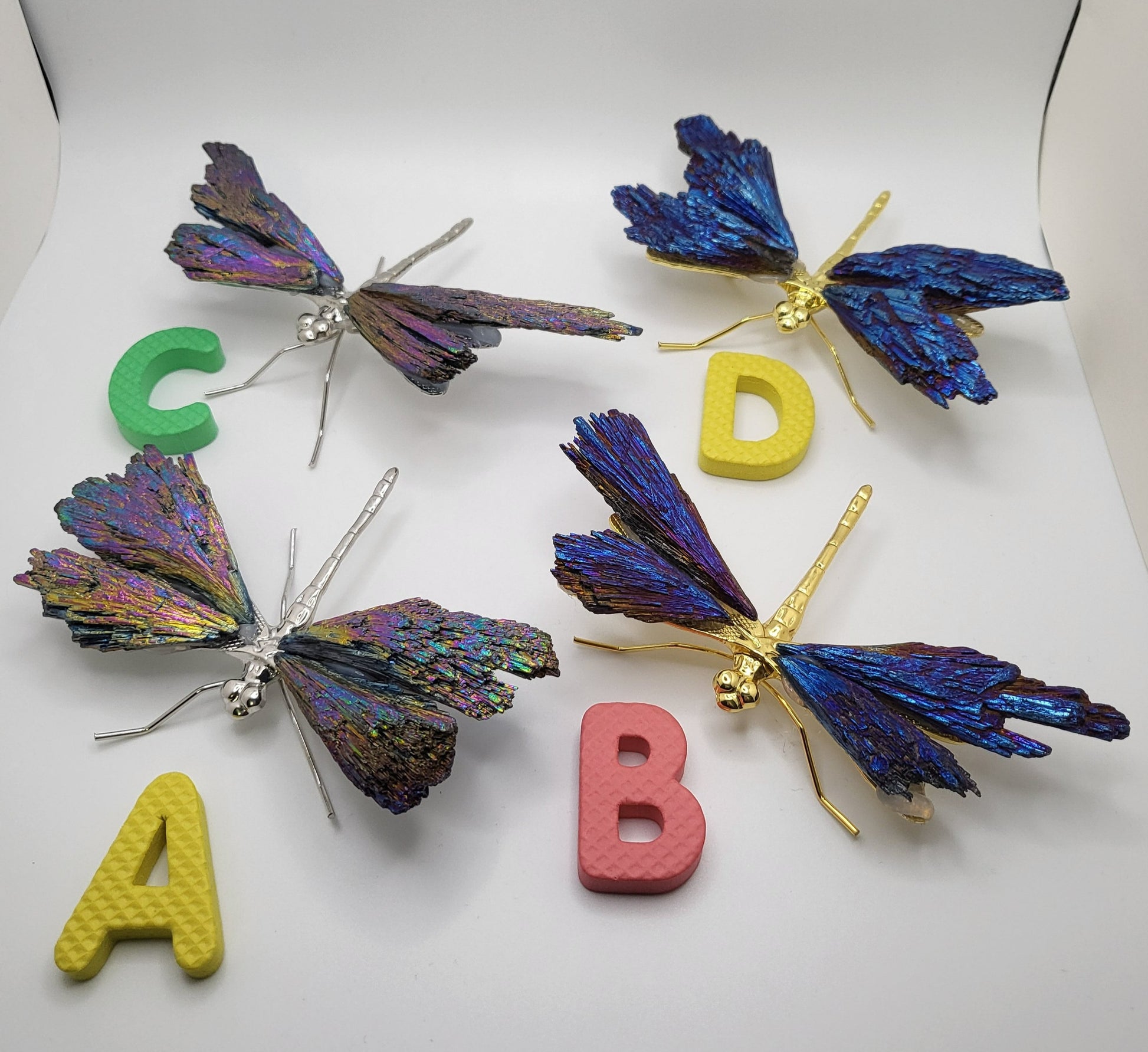 Aura coated Kyanite Dragonfly. These are amazing!!! Each one is so different. Titanium Aura coated Kyanite has been mounted to either a silver or gold colored dragonfly. The dragonfly legs can be moved around so it can sit taller or lower, depending on what you want. See pictures and let us know if you have any questions.